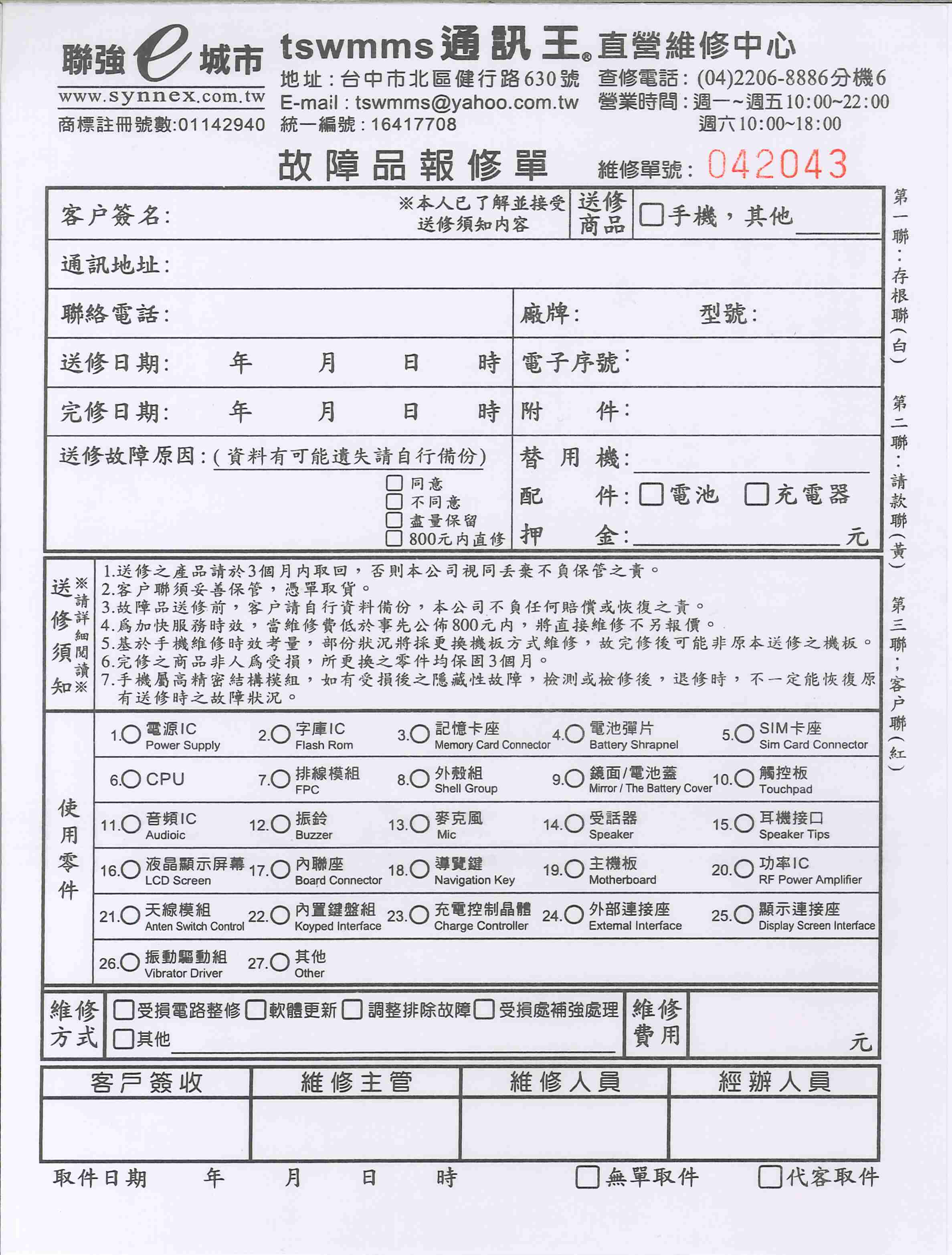 寄件維修,請下載故障品報修單"或用便條紙填寫送修資料後,連同故障機寄到本公司,以便維修完成後寄回